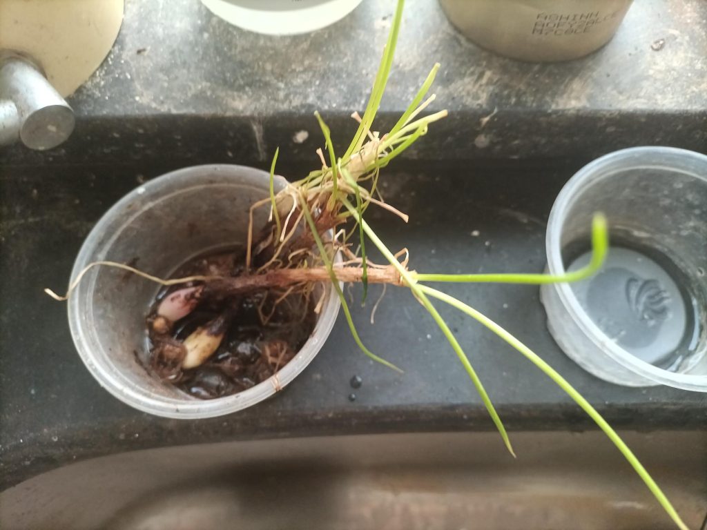 於是,我嘗試將其栽種保存。 方法有二,一曰長養,一曰短養。: 一,長養:用一般盆栽,插入培養土中。附圖是用沙作土,沙更透氣,容易清洗。 (沙不含養份。但短期栽種,葱頭已含基本養份,供其生長。)