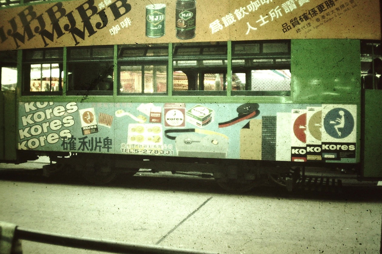 當時我已受過基本設計教育。明白甚麼是「視覺引導」,心中不是想著一個怎樣花巧的畫面,而是著重考慮廣告位是一個長條型,又有固定前進方向,過路的人會怎去看? 解柝: KORES牌子放在前端,重覆斜排,增加動感(剛好「樓上」的咖啡廣告也同一手法。智者所見略同也。)引導視覺往右去看產品。 車尾端重複數個打字紙包裝,方向性指向車門,而非反指左方,此順乘客上車之勢也。(「貪心」的設計會指向左,與乘客之勢相左,反而不妙。) 今日有噴畫有photoshop有scanner有電腦,但別忘了主角應是「廣告概念」與「設計」。