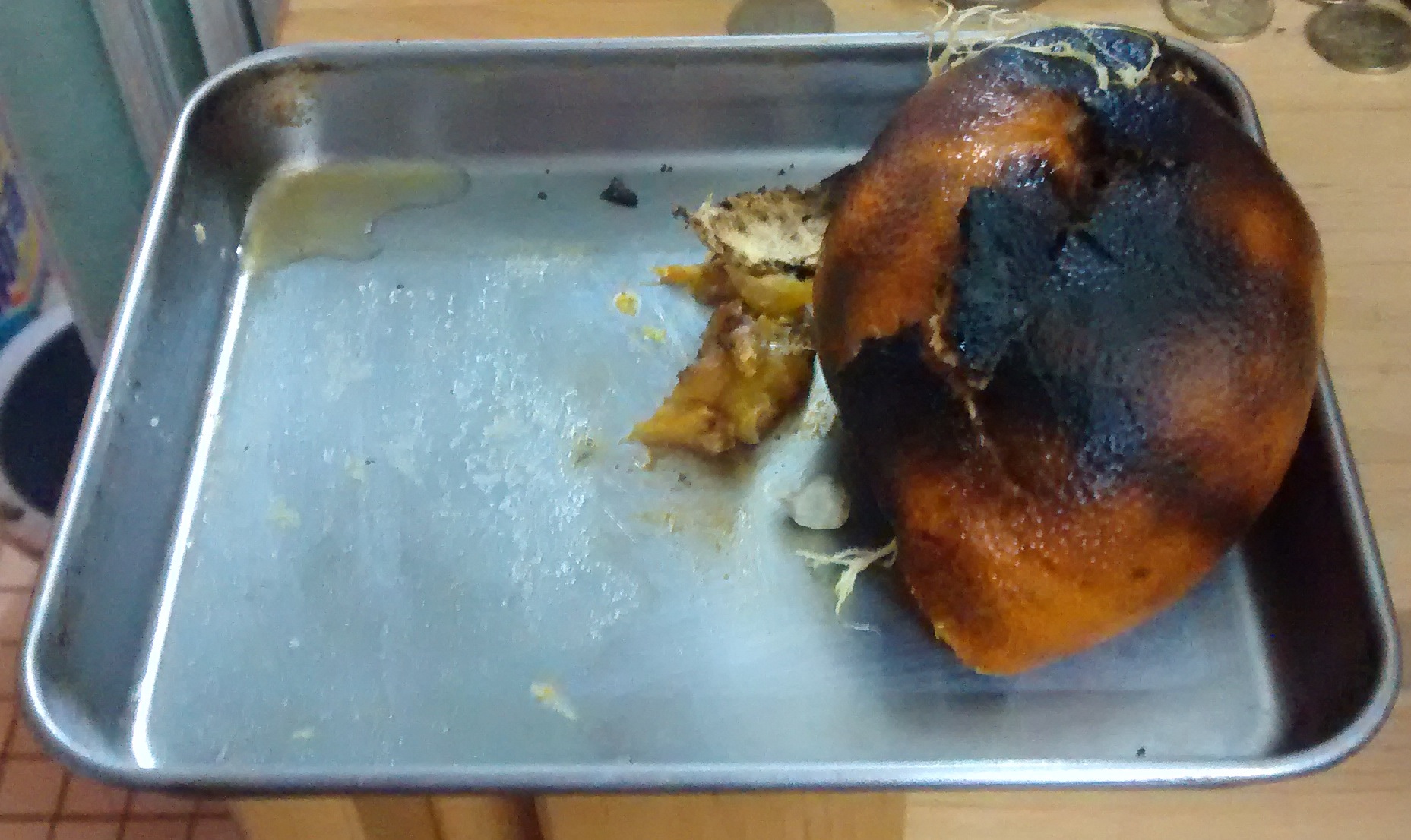 不怕焦燶,皮是不吃的。待稍涼後打開吃肉。