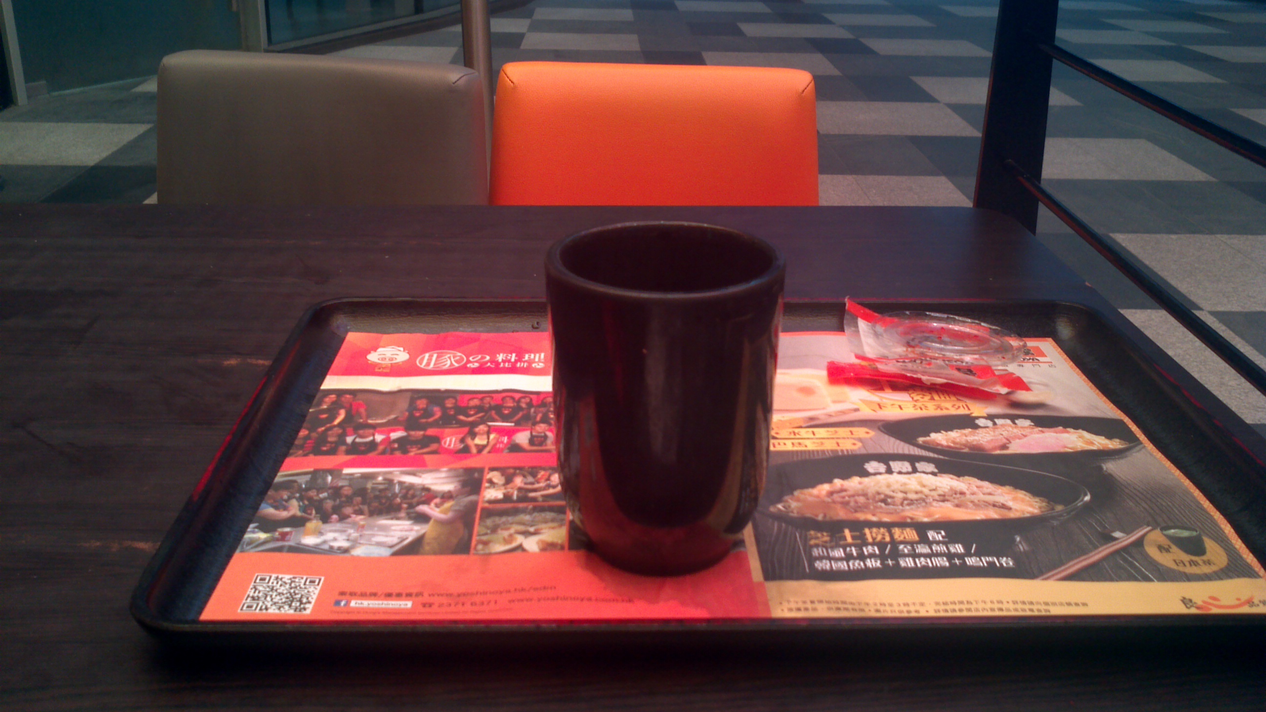 我在此吃了一個簡單的牛肉飯下午茶。飯吃完了,正在享用那杯綠茶。一個年輕的工作人員過來收盤子,我將未喝完的綠茶杯子拿開,示意他可以把托盤拿走。 我旁邊的桌也有另外的空盤子待清理。 在其它店子,想當然員工會將各盤子叠在一起,速速拿走,是吧?